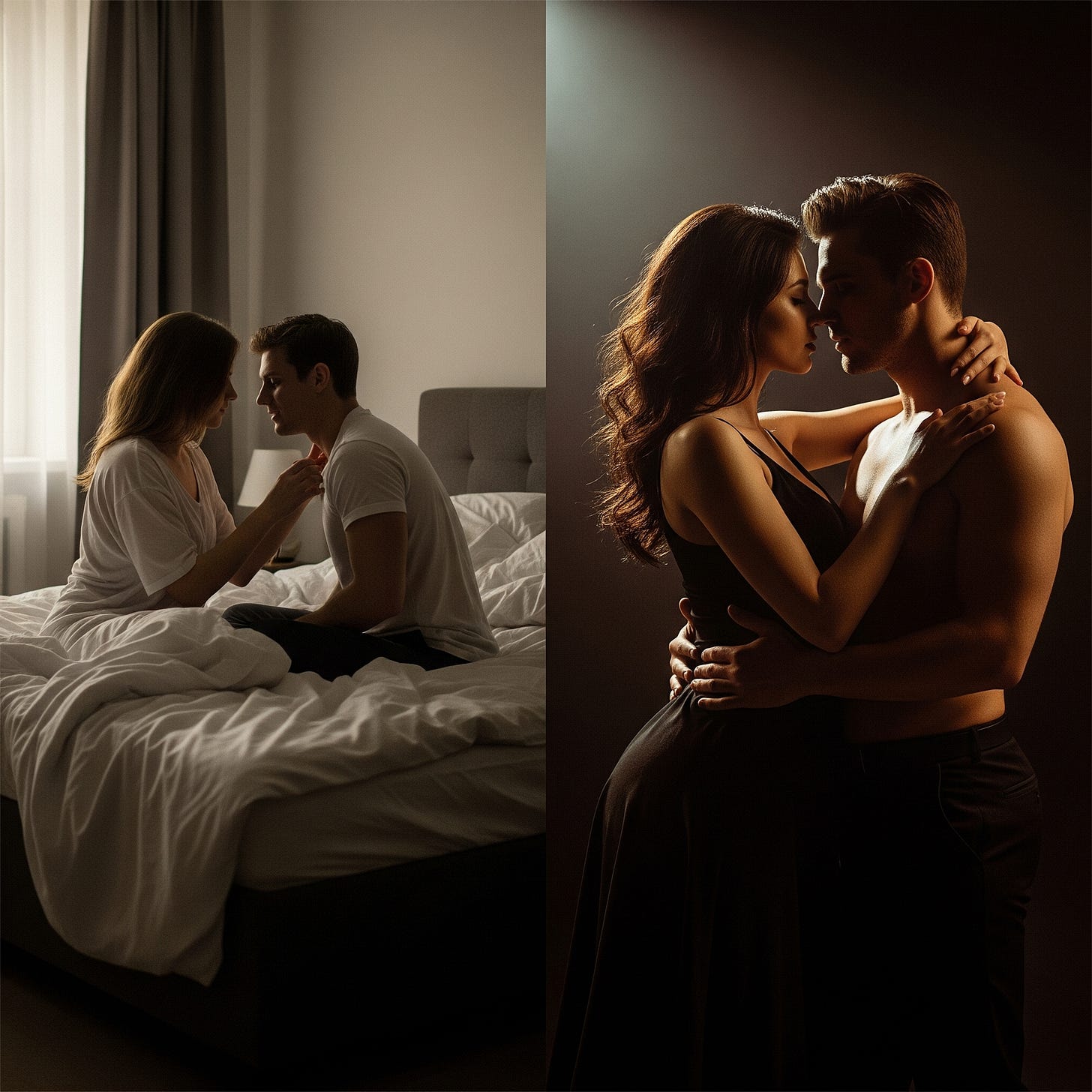 În schimb, în realitate, totul este mult mai subtil, mai imprevizibil. Lumina este mai slabă, iar umbrele nu sunt perfecte. Aici nu există coregrafii, ci doar instincte, nevoi și dorințe ce se intersectează într-un moment de autenticitate. Nu există ritm impus de un regizor, mișcările sunt lente, uneori haotice, dar fiecare respirație și fiecare atingere sunt dictate de conexiunea reală dintre cei doi. Corpul ei nu mai este un obiect de admirat, ci un loc unde se întâmplă o întâlnire de suflete. Degetele sale se mișcă cu mai puțină precizie, dar cu o vulnerabilitate mult mai profundă, în timp ce el o explorează nu doar fizic, ci și emoțional, fără a urmări o fantezie perfectă, ci doar dorința de a înțelege și de a se conecta. Aici, nu există fantezia unui scenariu impus, ci doar trăirea prezentului, cu ritmuri neregulate și reacții spontane, fiecare clipă fiind despre trăirea autentică și profundă a momentului.